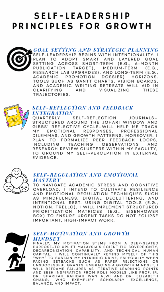 Self-leadership, in the realm of academia, extends beyond personal effectiveness; it encompasses a deliberate, reflective, and autonomous journey of shaping one’s identity as a scholar, educator, and contributor to the public intellectual sphere. To me, self-leadership is the capacity to guide oneself towards professional excellence, ethical integrity, and purposeful scholarship through conscious goal-setting, intrinsic motivation, and adaptive self-regulation. Within the context of Universiti Teknologi Malaysia (UTM), this leadership paradigm is particularly critical,as junior academics navigate the demands of teaching, research, service, and impact under evolving institutional and national expectations such as the MyRA, SETARA, and SDG-aligned KPIs.