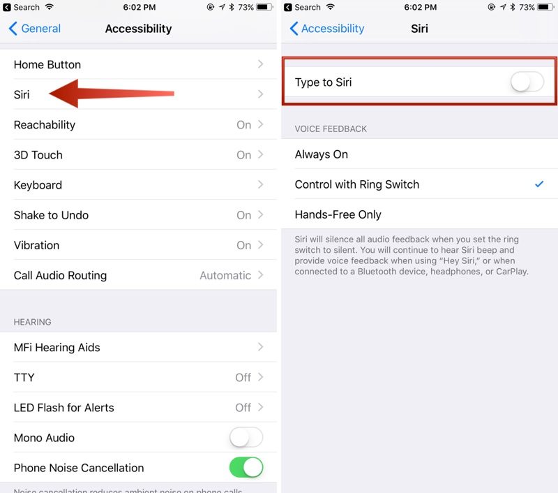- Toggle on “Type to Siri.”