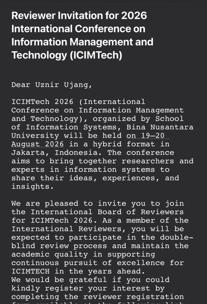 Received an invitation to join the International Board of Reviewers for the International Conference on Information Management and Technology (ICIMTech) 2026.
