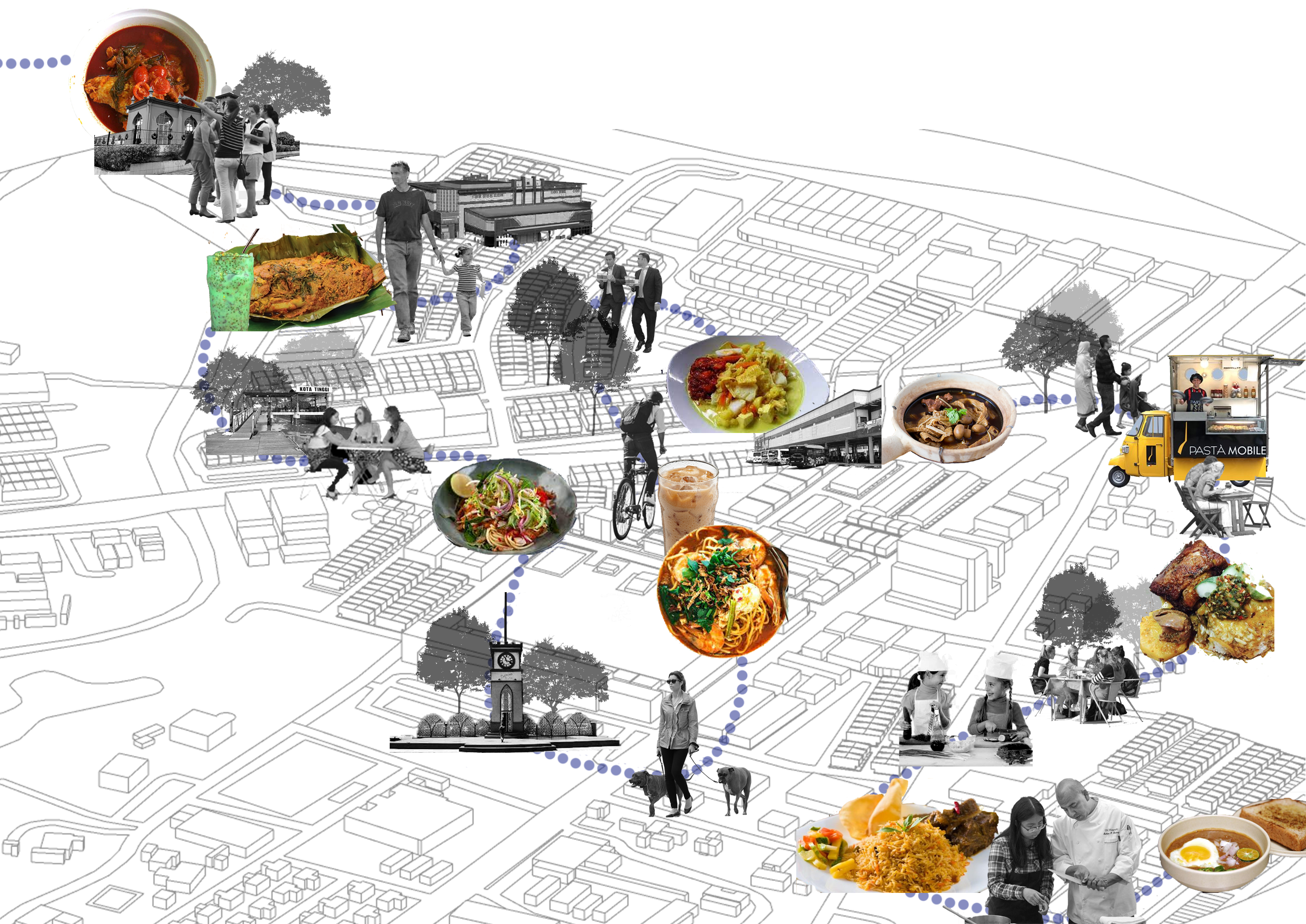 At the end of the journey (dotted blue line), there are a few activities that the locals can do alongside with the type of programs that I would emphasize in my building. For example, families start to spend their time together wandering around Bandar Kota Tinggi with their kids, youth starts to live their lives in a healthier way, cycling and walking, and most importantly, they get to seek knowledge on how to survive in this modern world, economically by joining and enjoying the activities held inside the building.