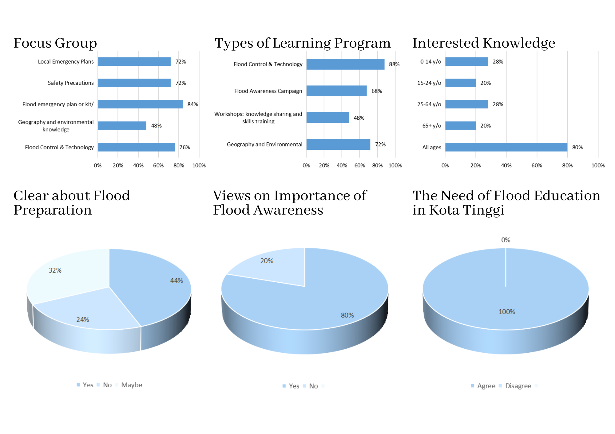 To collect more opinions from the Bandar Kota Tinggi residents to support my project statement, I had conducted a google form survey through social media platforms. The results showed that 56% of the respondents are not confident in their flood preparation and unclear about what to do in an emergency flood situation. Next, 80% of them agreed that it is important for everyone, especially the kids and elderlies to be aware of or know what to do during a flood situation. Out of my expectations, there is a 100% agreement on having a Flood Education Learning Centre inclusive of all age groups in Bandar Kota Tinggi. The area of knowledge that the respondents are interested in is covering from geographical, environmental, flood technology, safety precautions to emergency plans.