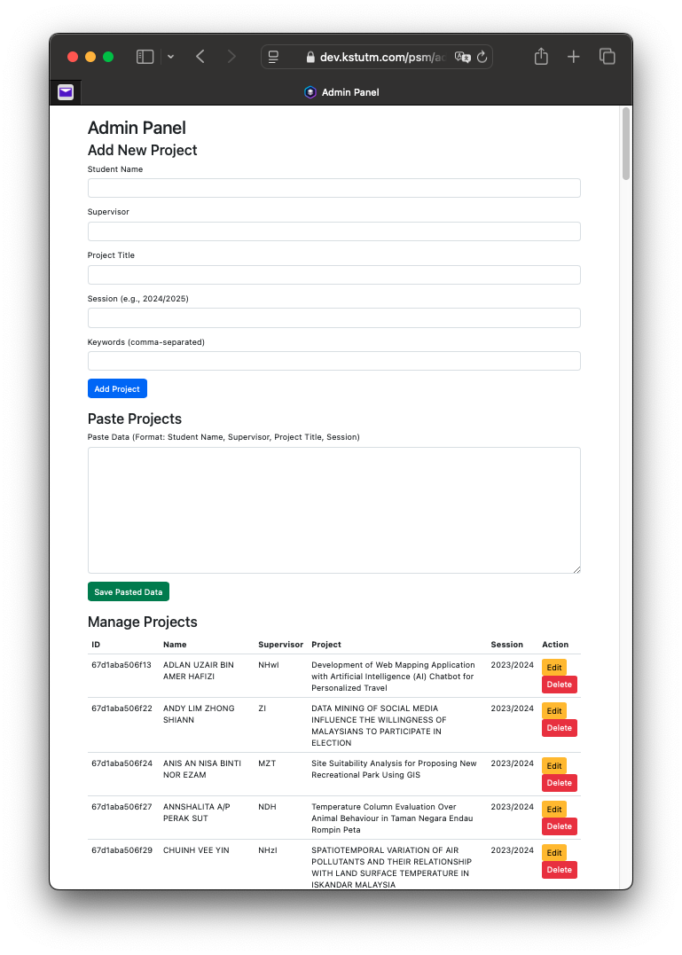 In today’s digital age, managing and accessing academic data efficiently is crucial for educational institutions. This article provides a comprehensive overview of the development of a web-based application designed to manage and display student final year project (Projek Sarjana Muda) data for the Bachelor of Science in Geoinformatics with Honours program at Universiti Teknologi Malaysia (UTM). The application was built using PHP, JavaScript, CSS, and AJAX, with data stored in JSON format. It was hosted on Hostinger and designed to be fast, responsive, and user-friendly.