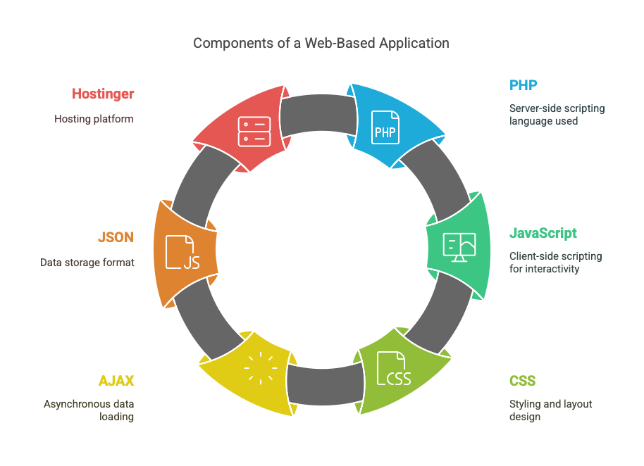 The application was developed using a combination of modern web technologies. The frontend was structured using HTML5, styled with CSS3 and Bootstrap 5 for a responsive and professional layout, and enhanced with JavaScript to facilitate dynamic content. AJAX was used for asynchronous data retrieval, ensuring smooth user interactions without page reloads. While analytics features will be incorporated in future versions, the current implementation primarily focuses on efficient data handling. The backend was built using PHP for server-side processing, with JSON as the primary data storage format. The application was deployed on Hostinger to ensure fast and reliable access. Additional tools such as Vis.js may be integrated in later updates to visualize supervisor-student networks.