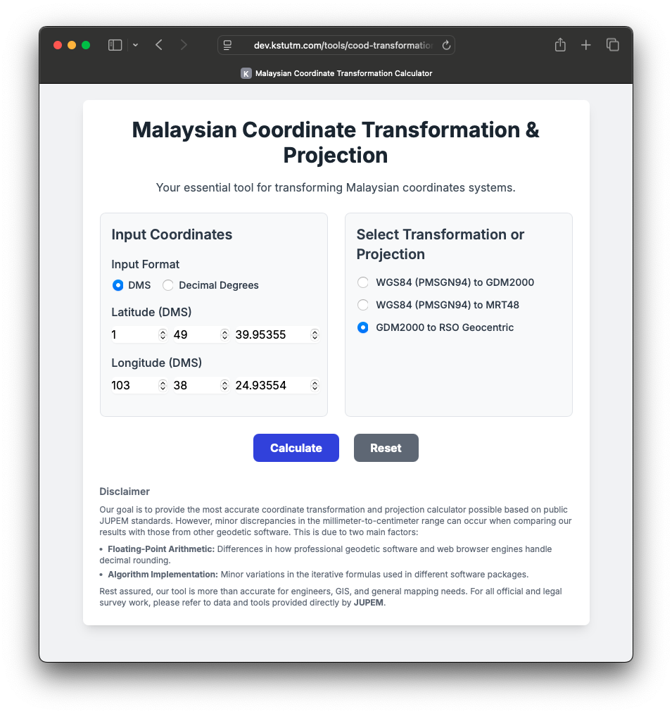 The Malaysian Coordinate Transformation & Projection calculator is designed for ease of use, featuring a clean interface that accepts both DMS (Degrees, Minutes, Seconds) and Decimal Degree inputs. While it serves as an exceptionally accurate tool for engineers, GIS data management, and educational purposes, the developers rightly advise that all official and legal survey work must be referred to and certified by JUPEM.