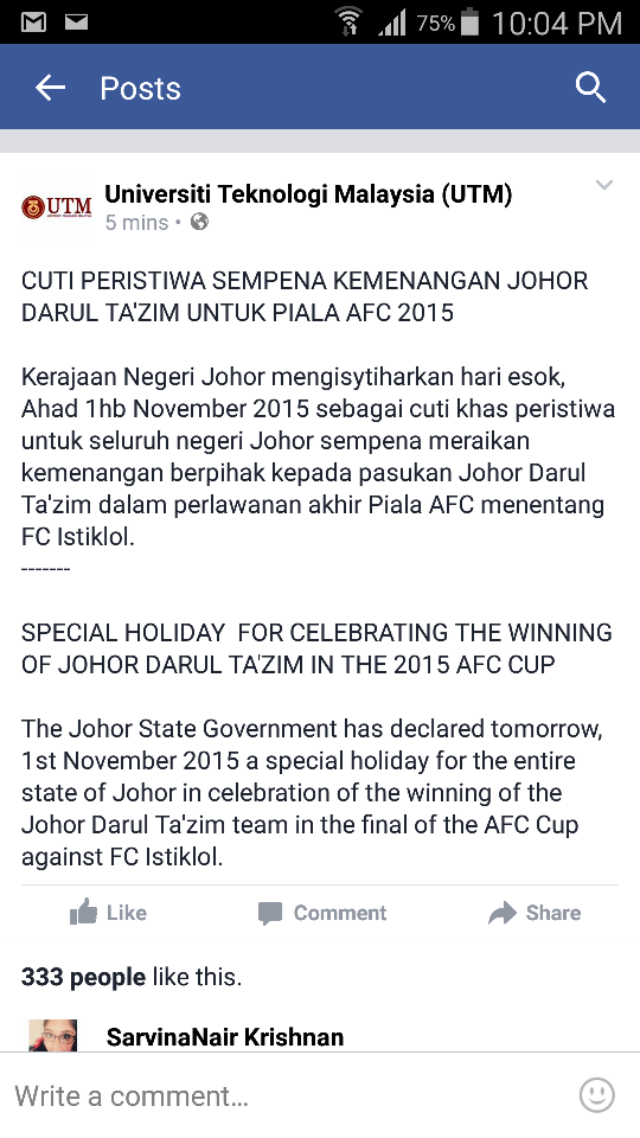 Congratulations JDT and Public Holiday